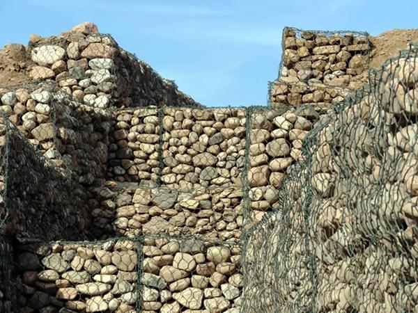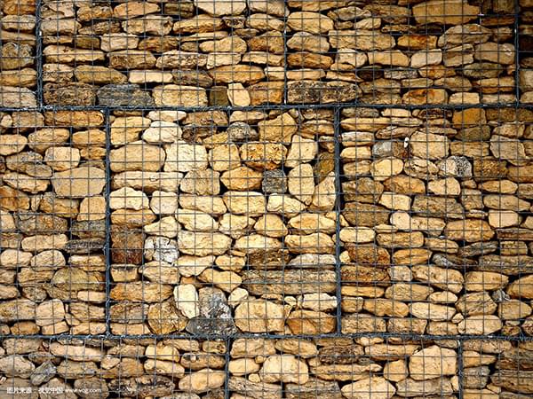 ②稳定:石块安装自身稳定,大面朝下,适当摇动或敲击,使其平稳。填充材料容重应不小于1.70吨/立方米。裸露的填充石料,表面应以人工或机械砌垒整平,石料间应相互搭接。每施工完一层石笼后,背面挂好土工布,同时跟着回填并夯实,确保石笼的稳定性,夯实要达到设计要求。在施工完一层石笼后,现场进行检查合格后才可进行其二道工序施工。